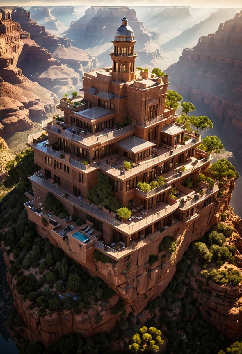 (The colonial city of the future, in the mist-filled Grand Canyon, on an unknown Earth-like planet, 2 moon on sky, Spaceship flight connects colonies:1.3), (Richard Meier:1.2), (Mario Botta:1.3), (avant-garde, future, reality, science fiction, photorealistic), (modern architecture:1.2), (Large Files, Ultra Realistic, 8K, 16k, FHD, HD, VFX, Perfect, Photography, composition, Architecture Sales Photography, Architecture Competition, Ultra High Resolution, Cinematography, High Resolution Image:1.1), (dramatic lighting, direct sunlight, ray tracing, clear shadow:1.2), (real landscape:1.1), (blurred background:1.0), (urban background, more_details) , great lighting, clear, hillscastel, treehouse