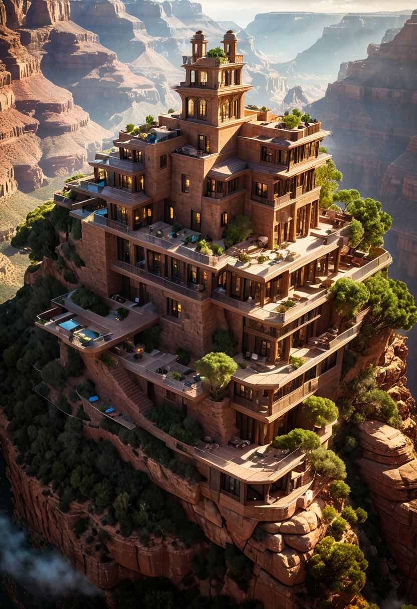 (The colonial city of the future, in the mist-filled Grand Canyon, on an unknown Earth-like planet, 2 moon on sky, Spaceship flight connects colonies:1.3), (Richard Meier:1.2), (Mario Botta:1.3), (avant-garde, future, reality, science fiction, photorealistic), (modern architecture:1.2), (Large Files, Ultra Realistic, 8K, 16k, FHD, HD, VFX, Perfect, Photography, composition, Architecture Sales Photography, Architecture Competition, Ultra High Resolution, Cinematography, High Resolution Image:1.1), (dramatic lighting, direct sunlight, ray tracing, clear shadow:1.2), (real landscape:1.1), (blurred background:1.0), (urban background, more_details) , great lighting, clear, hillscastel, treehouse