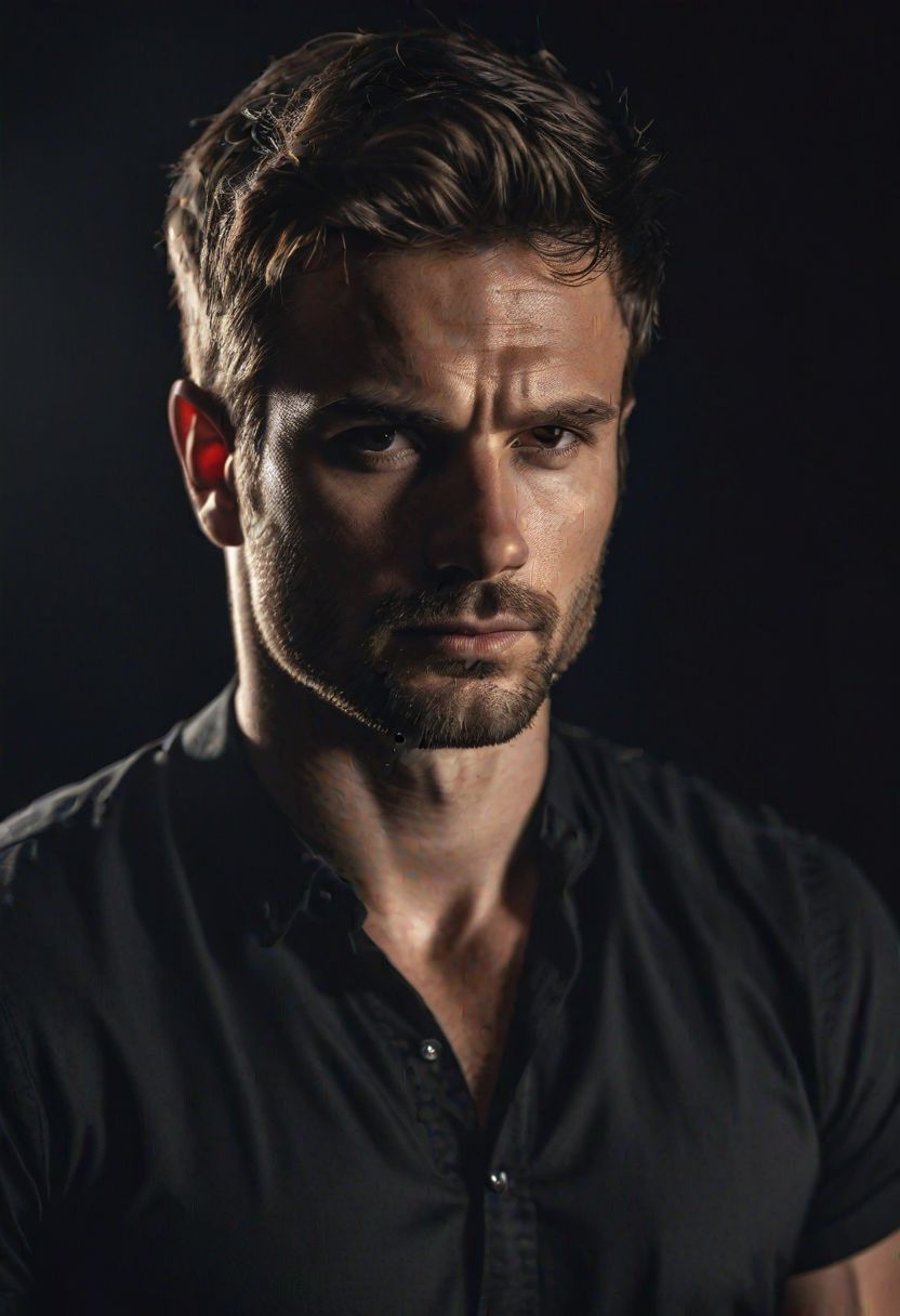 high quality, portrait photo of 30 y.o european man, wearing black shirt, serious face, detailed face, skin pores, cinematic shot, dramatic lighting