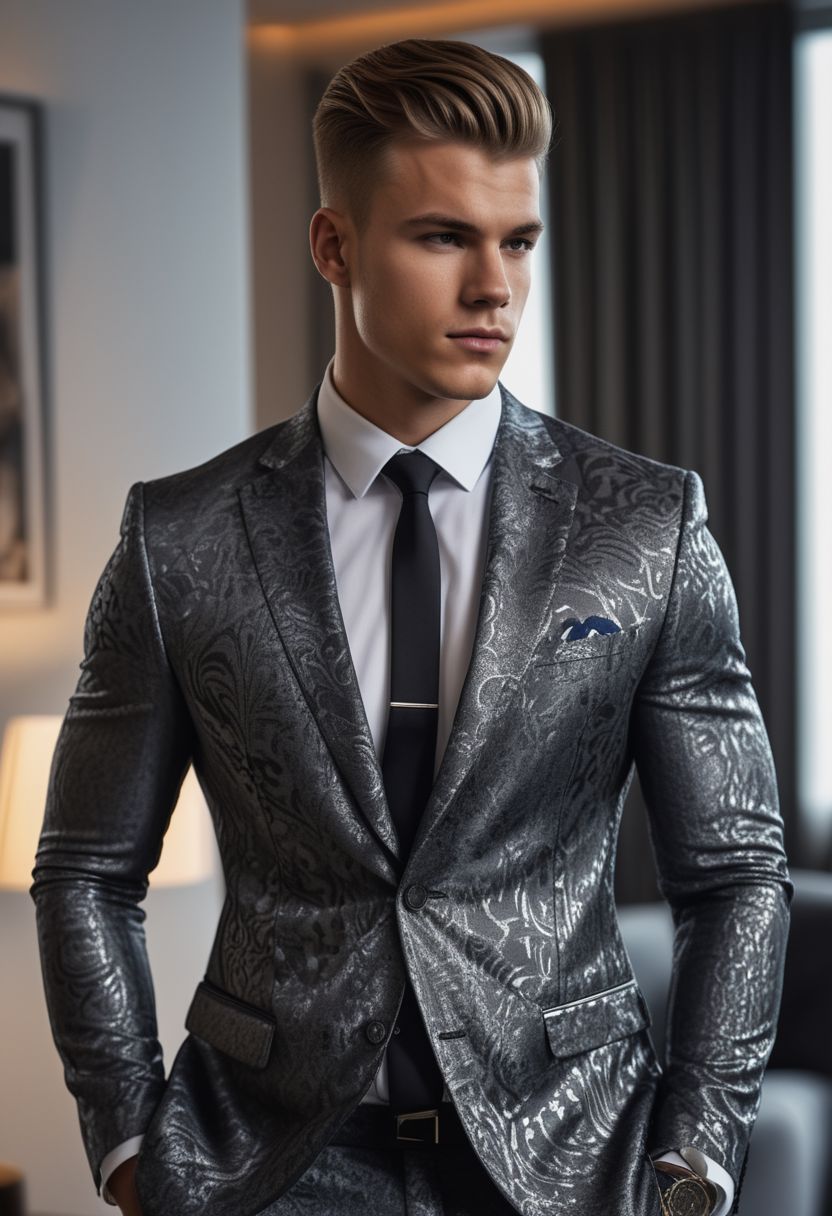 a strong 22-year-old german hunk bodybuilder male, with a fringe up undercut hairstyle, detailed face, mindless expression, wearing a skin tight dark-gray suit with silver patterns, wearing pants, on a modern living room, standing at attention pose, looking at viewer, portrait, photography, detailed skin, realistic, photo-realistic, 8k, highly detailed, full length frame, High detail RAW color art, diffused soft lighting, shallow depth of field, sharp focus, hyperrealism, cinematic lighting