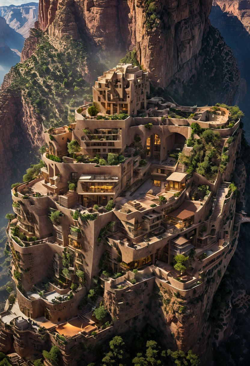 (The colonial city of the future, in the mist-filled Grand Canyon, on an unknown Earth-like planet, 2 moon on sky, Spaceship flight connects colonies, waterfulls:1.3), (Machu Picchu, a mountain settlement, incredibly spectacular:1.2), (Mario Botta:1.3), (avant-garde, future, reality, science fiction, photorealistic), (modern architecture:1.2), (Large Files, Ultra Realistic, 8K, 16k, FHD, HD, VFX, Perfect, Photography, composition, Architecture Sales Photography, Architecture Competition, Ultra High Resolution, Cinematography, High Resolution Image:1.1), (dramatic lighting, direct sunlight, ray tracing, clear shadow:1.2), (real landscape:1.1), (blurred background:1.0), (urban background, more_details) , ac_neg1, great lighting, clear, hillscastel, extrusionbuilding, vertical