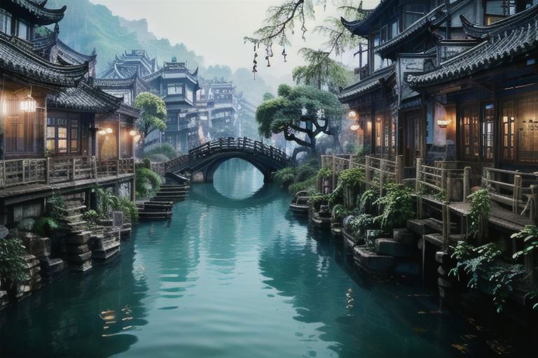 traditional chinese landscapemasterpiece, best quality, 32k uhd, insane details, intricate details, hyperdetailed, hyper quality, high detail, ultra detailed, Masterpiece, 1girl, <lora:~Q?-l4Nafo traditional chinese landscape:0.8>