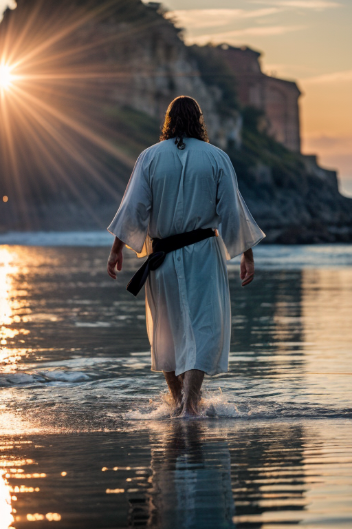 Raw hdr photo of jesus christ, backview, full body, ((walking above water)) at sunrise, beach, majestic, inspiring, disquieting, intricate high details, (water reflections), focus, togue, mantle, beard, (hair blowing in the wind), dramatic light, ((sun rays in a blue sky)), clear sky, (hyper realistic:1.2), (high detailed skin:1.2), 8k uhd, dslr, high quality, film grain, Fujifilm XT3, epiCRealism
