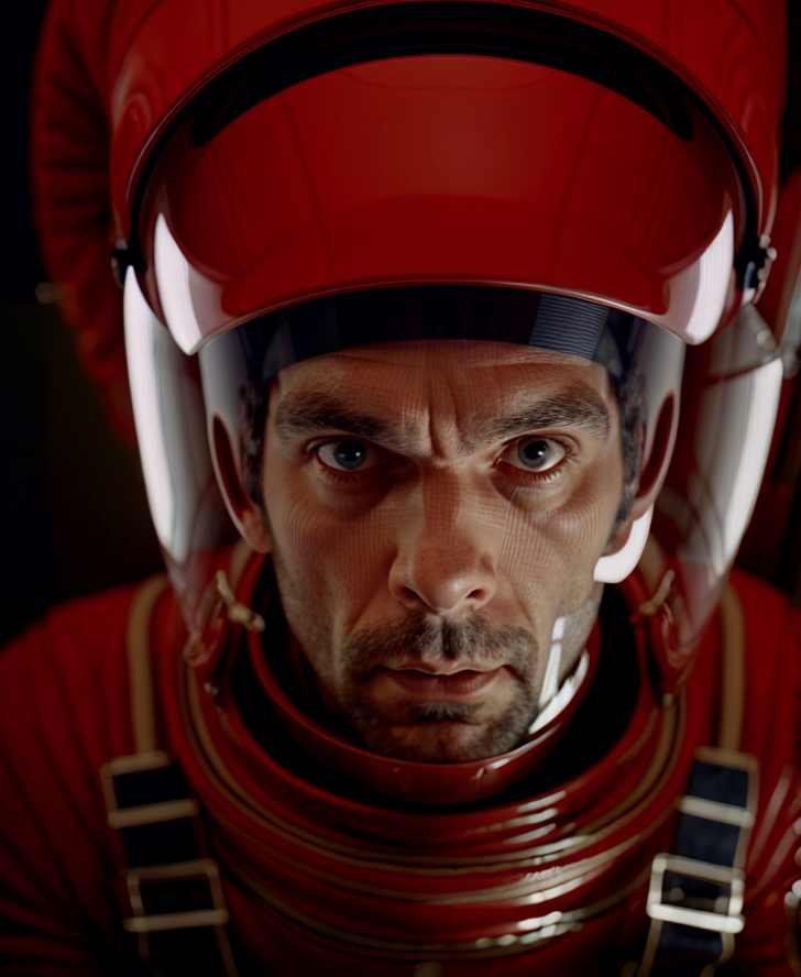 a man in a red space suit is staring at the camera, 2001, directed by Stanley Kubrick, a hologram by Jean Fautrier, cgsociety, les automatistes, reimagined by industrial light and magic, redshift, criterion collection <lora:2001:1>