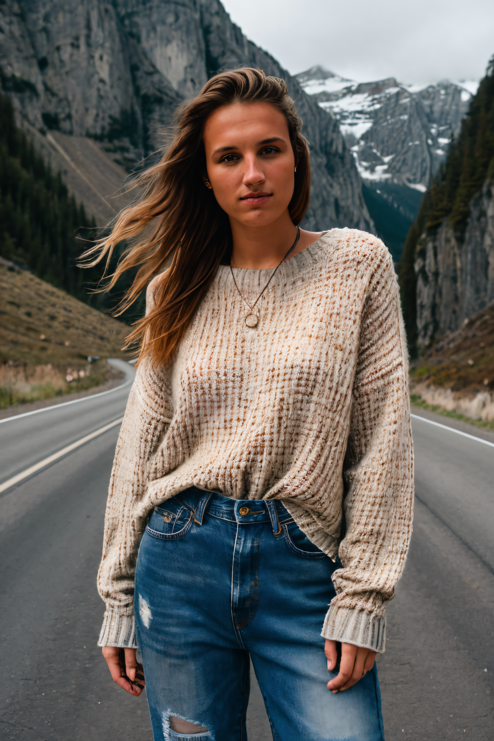 RAW photo of bekeluebben,face portrait, Oversized knit top and distressed jeans for a road trip adventure, (high detailed skin:1.2), 8k uhd, dslr, soft lighting, high quality, film grain, Fujifilm XT3 , <lora:bekeluebben:1>