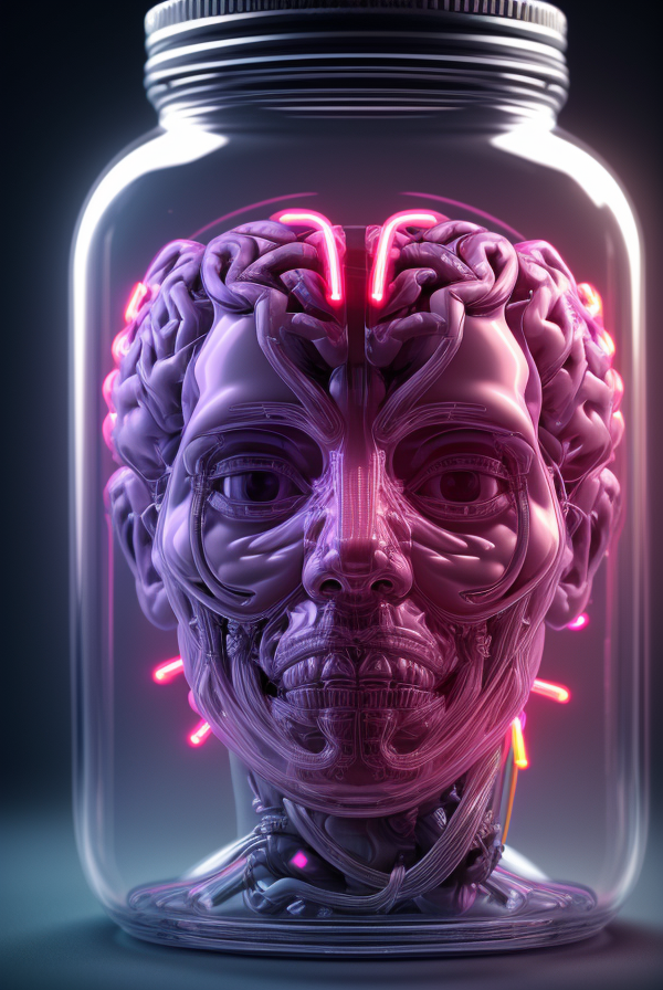 3d render, 4d render, a human head, human brain, in a jar, growing brain, neonpunk, neon lights, ultra complex details, intricate details, 35mm, depth of field, sharp focus,