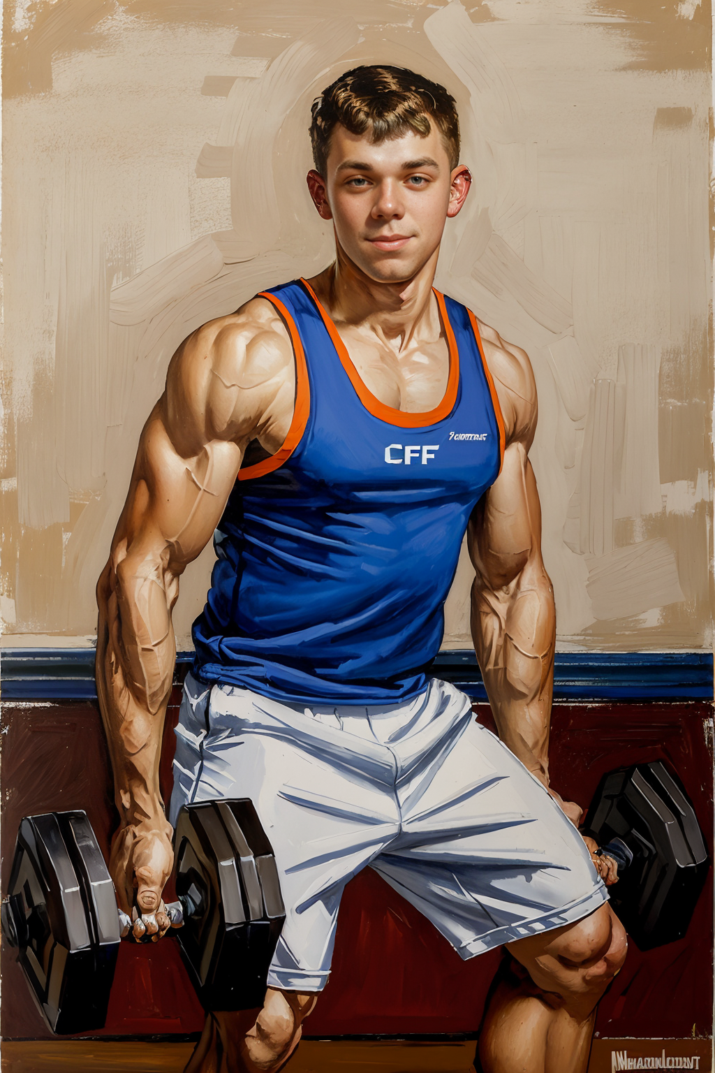 (in the style of Norman Rockwell), a gym weight room, lifting weights, dumbbell, painting of CFDawson, (age 21), slight smile, (wearing (tank top)) shorts, sneakers, ((full body portrait)), (painted by Norman Rockwell) <lora:CFDawson:0.75>