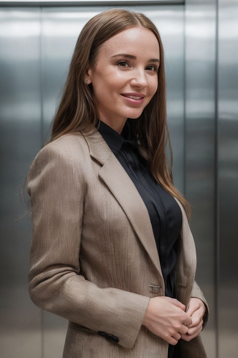 photo of S141_KaisaNord, a stunning woman, in an (elevator:1.2), wearing a (shirt:1.2) and (blazer:1.2), (smiling:1.1), (8k, RAW photo, best quality, depth of field, ultra high res:1.2), (absurdres, intricate, photorealistic, masterpiece, ultra-detailed:1.3)