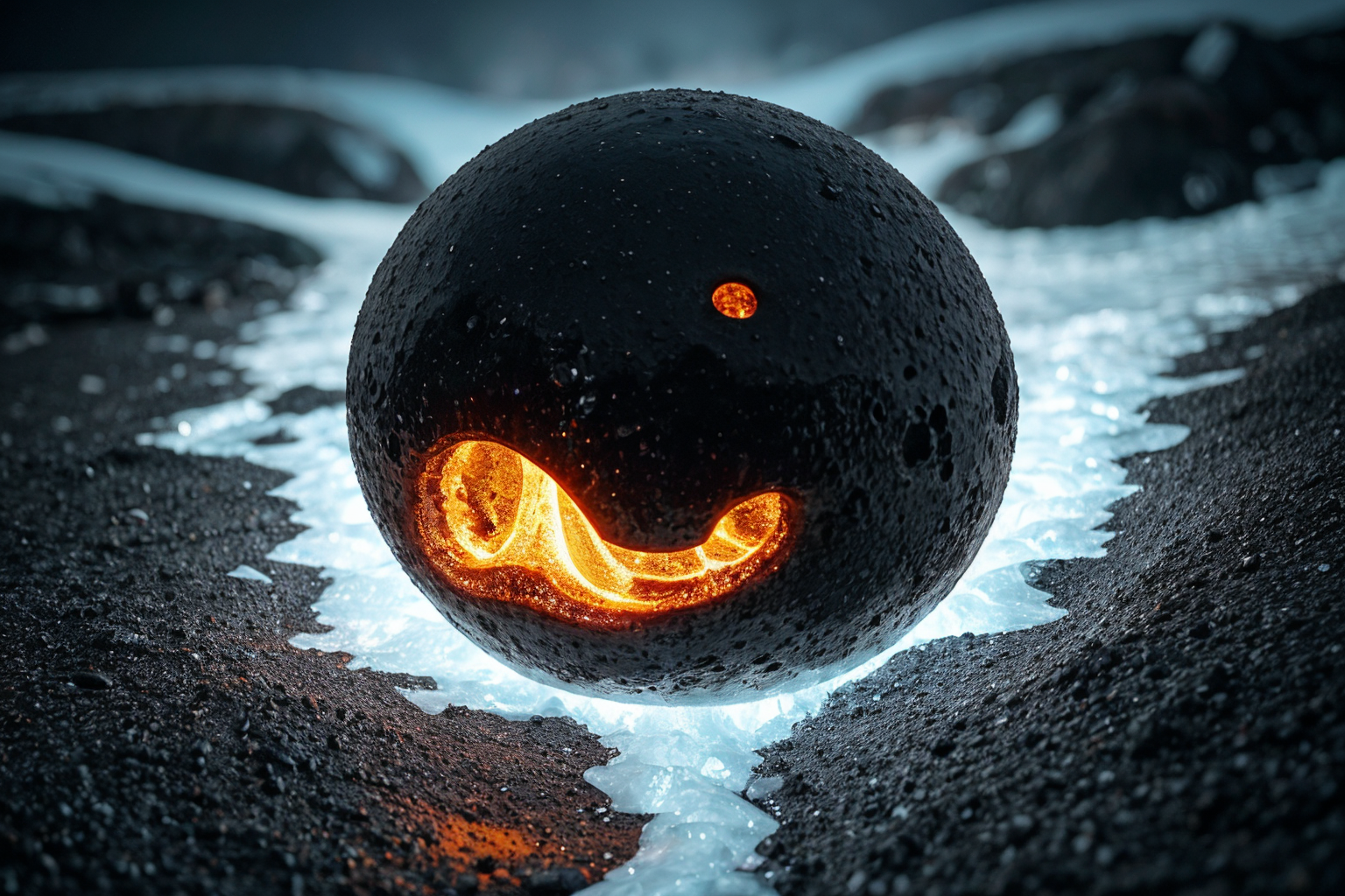 extreme closeup of a small blob of lava splashing onto the surface of a glacier at night, detailed sparks, detailed reflections on ice