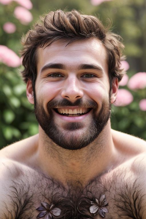 A close-up photo of a handsome hairy chested fit hucrain man, flowers, looking the viewer, Smile