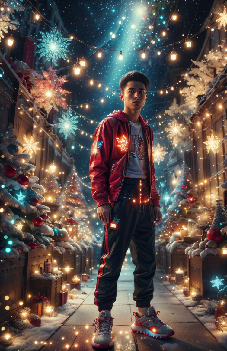 <lora:ChristmasWintery:1>, young man wearing a pair of glowing LED sneakers paired with iridescent trousers, (Masterpiece:1.3) (best quality:1.2) (high quality:1.1)