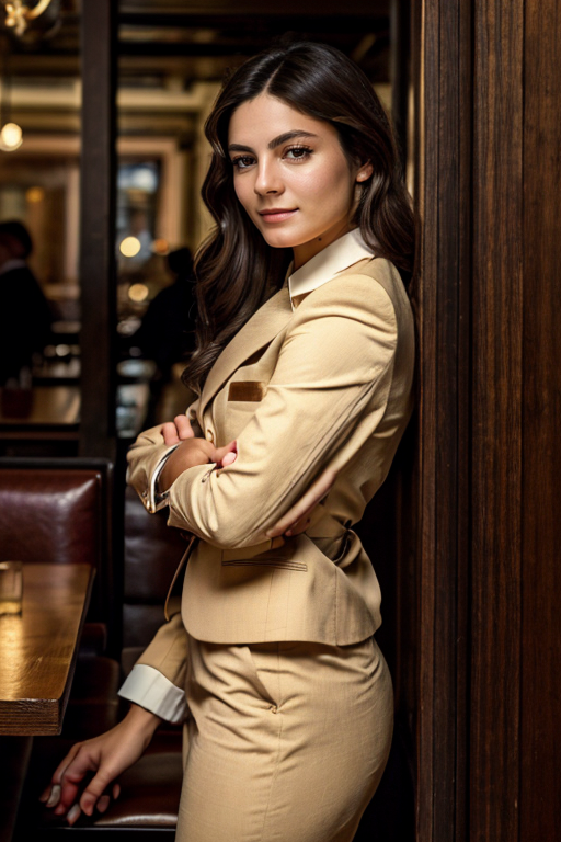 masterpiece, best quality, detailed face <lora:Monica1873Barbaro:1> a woman, 1girl, solo, m1873b, wearing beige business suit in restaurant