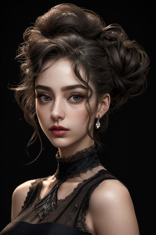 A detailed portrait of a young woman exuding elegance and natural grace. She has a voluminous updo hairstyle with wisps of hair tenderly framing her face. Her hazel eyes are accentuated by tasteful makeup, s. She wears a high-necked black top, suggesting a blend of casual refinement. The lighting should illuminate her face against a subdued background, emphasizing her calm and confident expression. High Fashion, dynamic, dramatic, elegant, High fashion supermodel, avant garde style fFaceDetaile