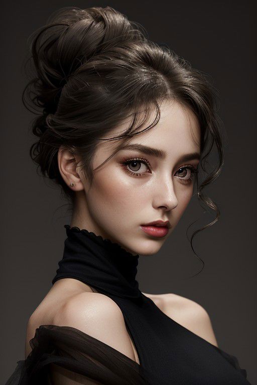 A detailed portrait of a young woman exuding elegance and natural grace. She has a voluminous updo hairstyle with wisps of hair tenderly framing her face. Her hazel eyes are accentuated by tasteful makeup, s. She wears a high-necked black top, suggesting a blend of casual refinement. The lighting should illuminate her face against a subdued background, emphasizing her calm and confident expression. High Fashion, dynamic, dramatic, elegant, High fashion supermodel, avant garde style fFaceDetaile