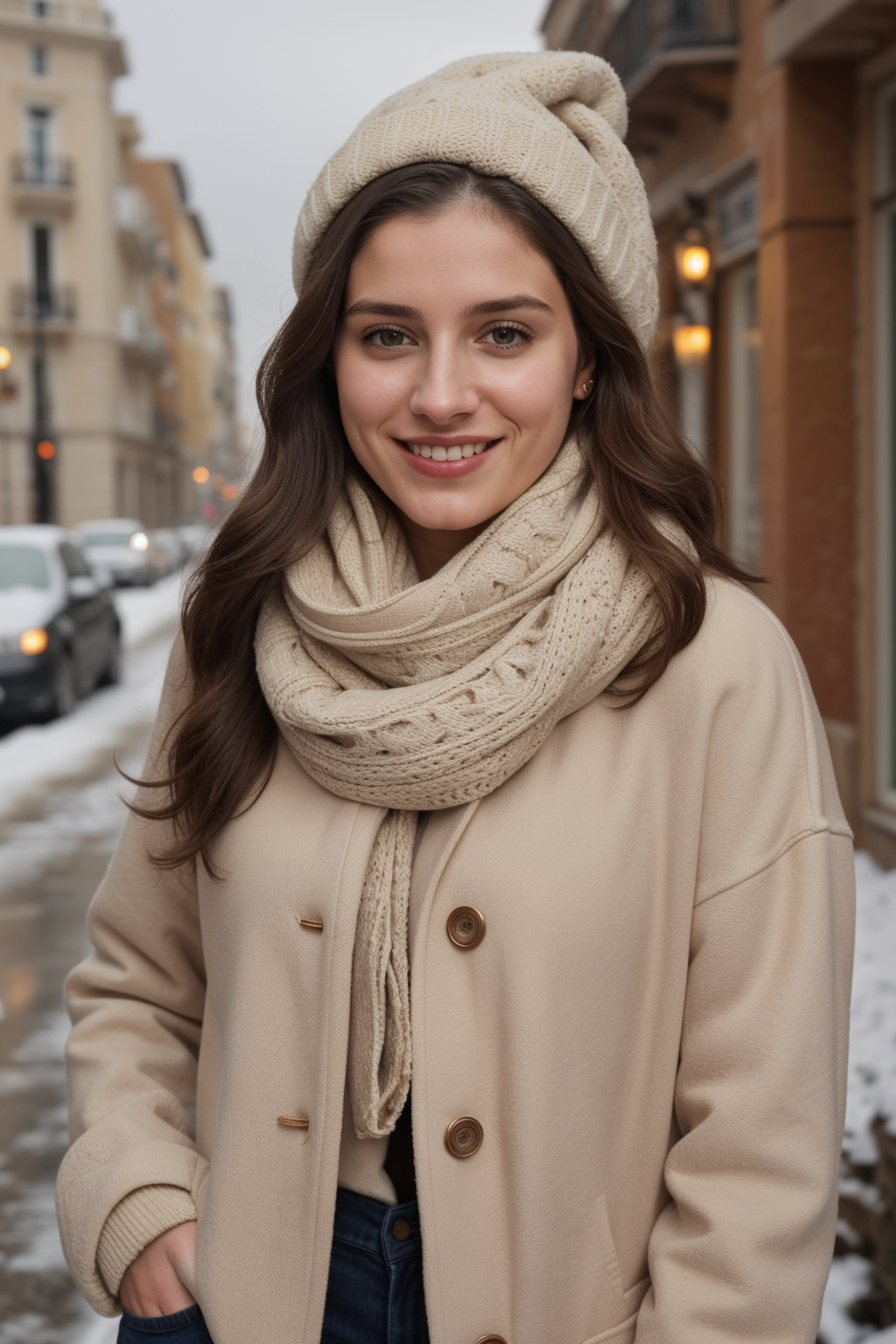 Candid photo of a young Spanish woman, age 20, wearing winter clothing with a warm scarf and a cozy hat, smiling gently, upper body framing, on a snowy street in Madrid under the soft diffused lighting of a cloudy winter day, shot at eye level on a Canon EOS 5D with a 50mm lens, in the style of Alberto Seveso., (masterpiece, best quality, hires, high resolution:1.2, 4k, 8k , high quality), extremely detailed, realistic, intricate details, highres