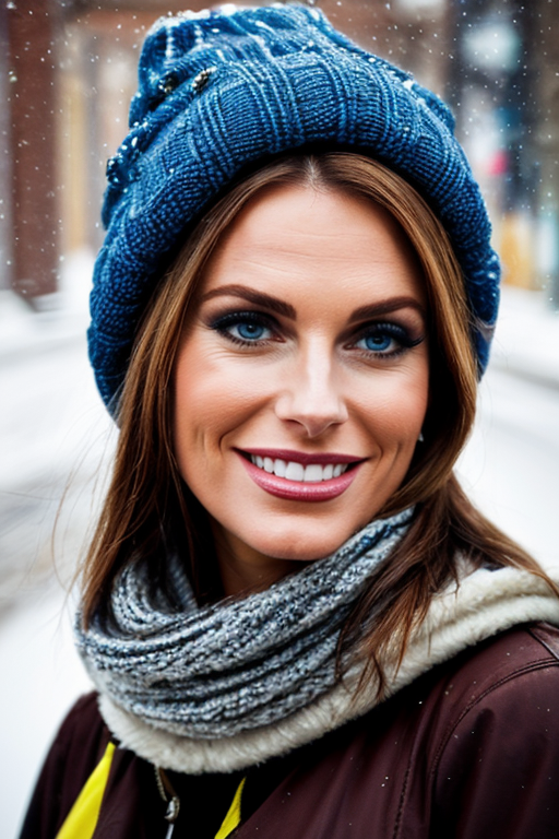 Candid photo of a young Spanish woman, age 20, wearing winter clothing with a warm scarf and a cozy hat, smiling gently, upper body framing, on a snowy street in Madrid under the soft diffused lighting of a cloudy winter day, shot at eye level on a Canon EOS 5D with a 50mm lens, in the style of Alberto Seveso., (masterpiece, best quality, hires, high resolution:1.2, 4k, 8k , high quality), extremely detailed, realistic, intricate details, highres