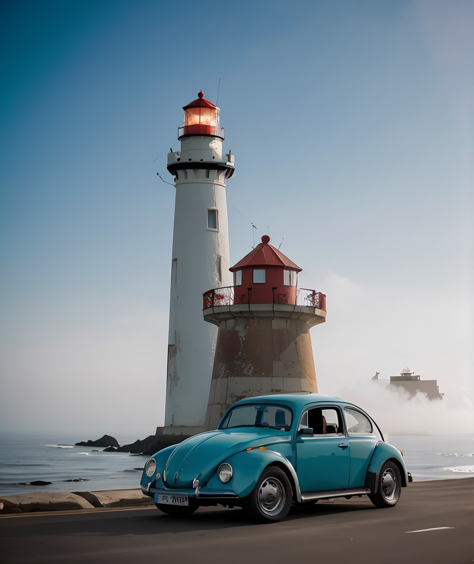 cinematic photo ,<lora:quiron_beetleVW_V1_Lora:0.87> beetleVWQuiron car, realistic, best quality, masterpiece, cinematic light, sidelighting, fog, fading lighthouse, chipped paint, broken beacon, lost guidance . 35mm photograph, film, bokeh, professional, 4k, highly detailed