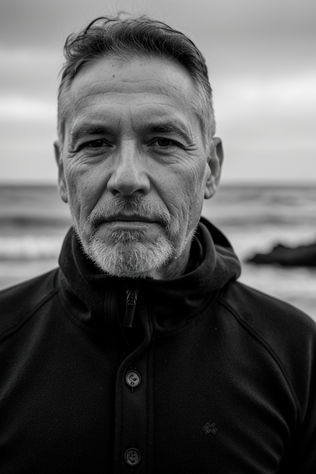 b&w photo of 54 y.o man, face, half body, body, high detailed skin, skin pores, coastline, overcast weather, wind, waves, 8k uhd, dslr, soft lighting, high quality, film grain, Fujifilm XT3