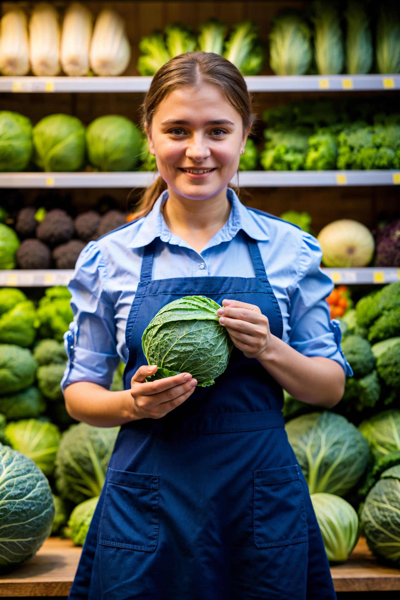 photo RAW,(Ukraine woman, the seller in the store, with an smiling expression, holds cabbage in her hand, blue uniform ,look to camera,(bokeh:1.1)), masterpiece, award winning photography, natural light, perfect composition, high detail, hyper realisti,(Fill with vegetables:1.2)