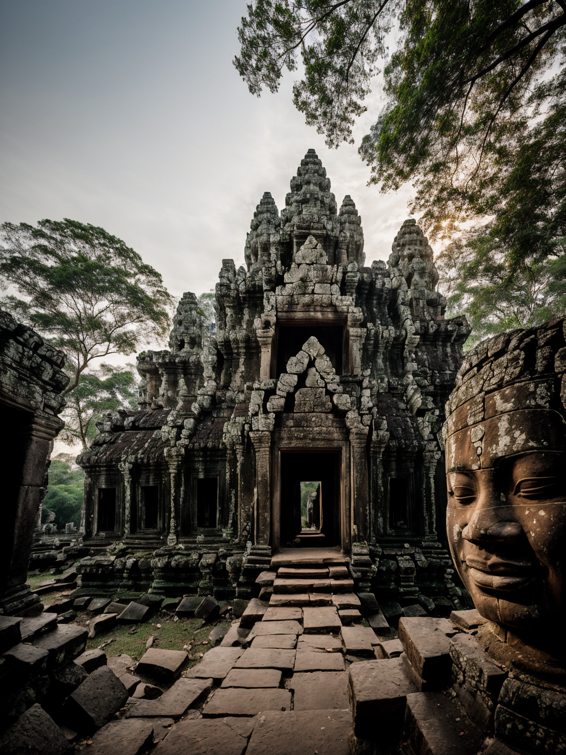 langscape of angkorwat at dawn, monk, ruins, temple, statue, most, tree, root, stone, epic, dim light <lora:ARWangkorwat:1>, <lora:add_detail:0.5>