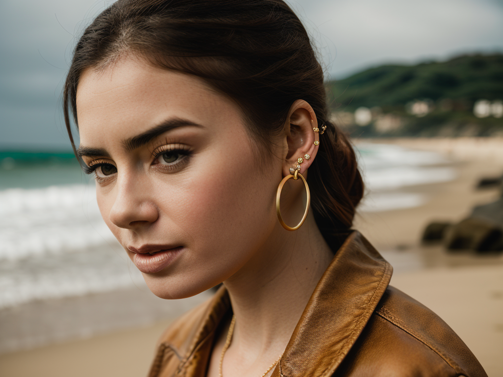 <lora:l1lyc0:1>, Realistic photo of a beautiful l1lyc0 woman, solo, brown hair, brown eyes, jewelry, sitting, earrings, outdoors, parted lips, day, bracelet, lips, beach, hoop earrings, realistic, soft lighting, professional Photography, Photorealistic, detailed, RAW, analog, sharp focus, 8k, HD, DSLR, high quality, Fujifilm XT3, film grain, award winning, masterpiece
