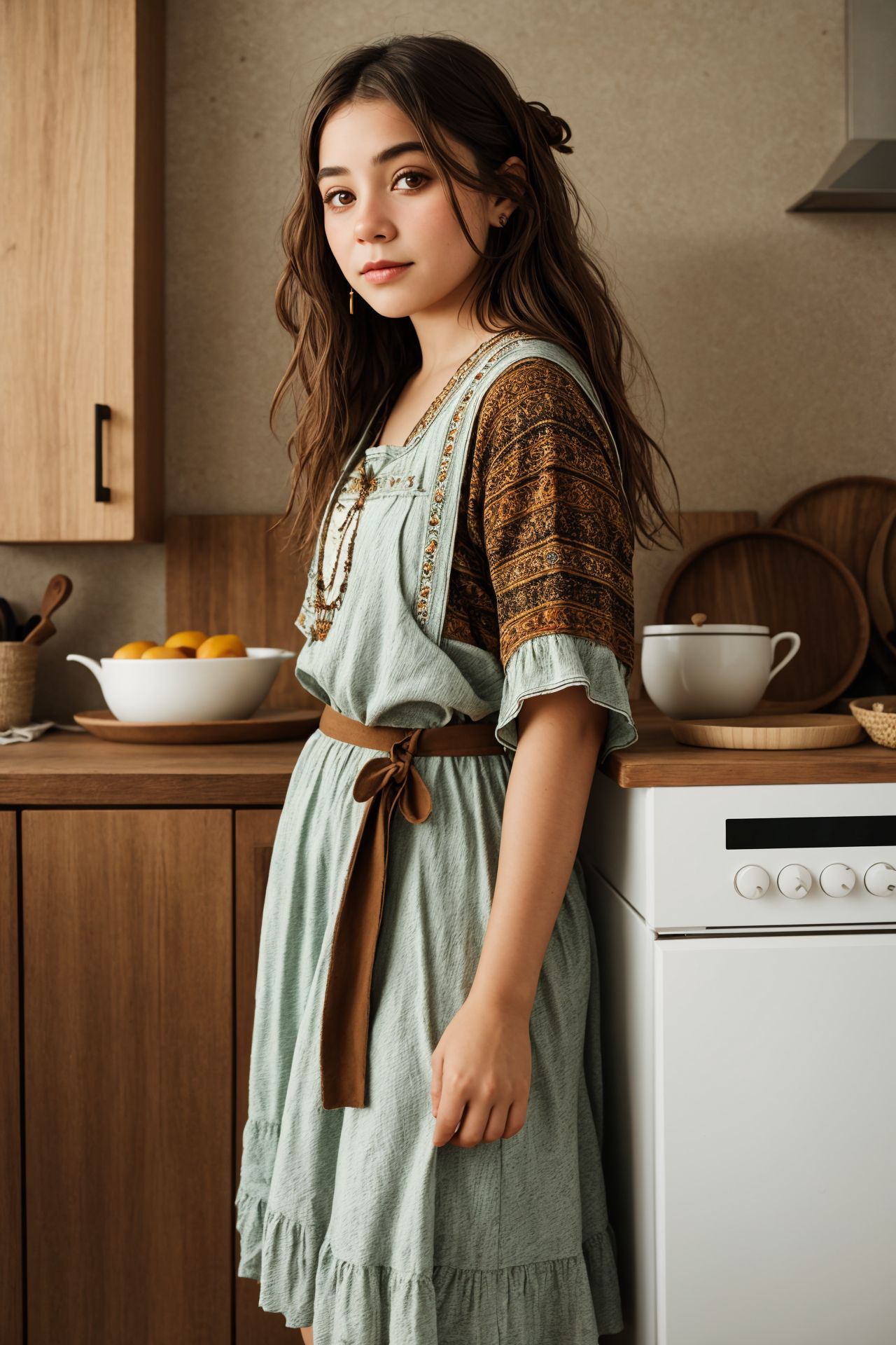 spanish dwarf, simple kitchen background, raw photo, boho fashion photography, stylish,trendy,editorial