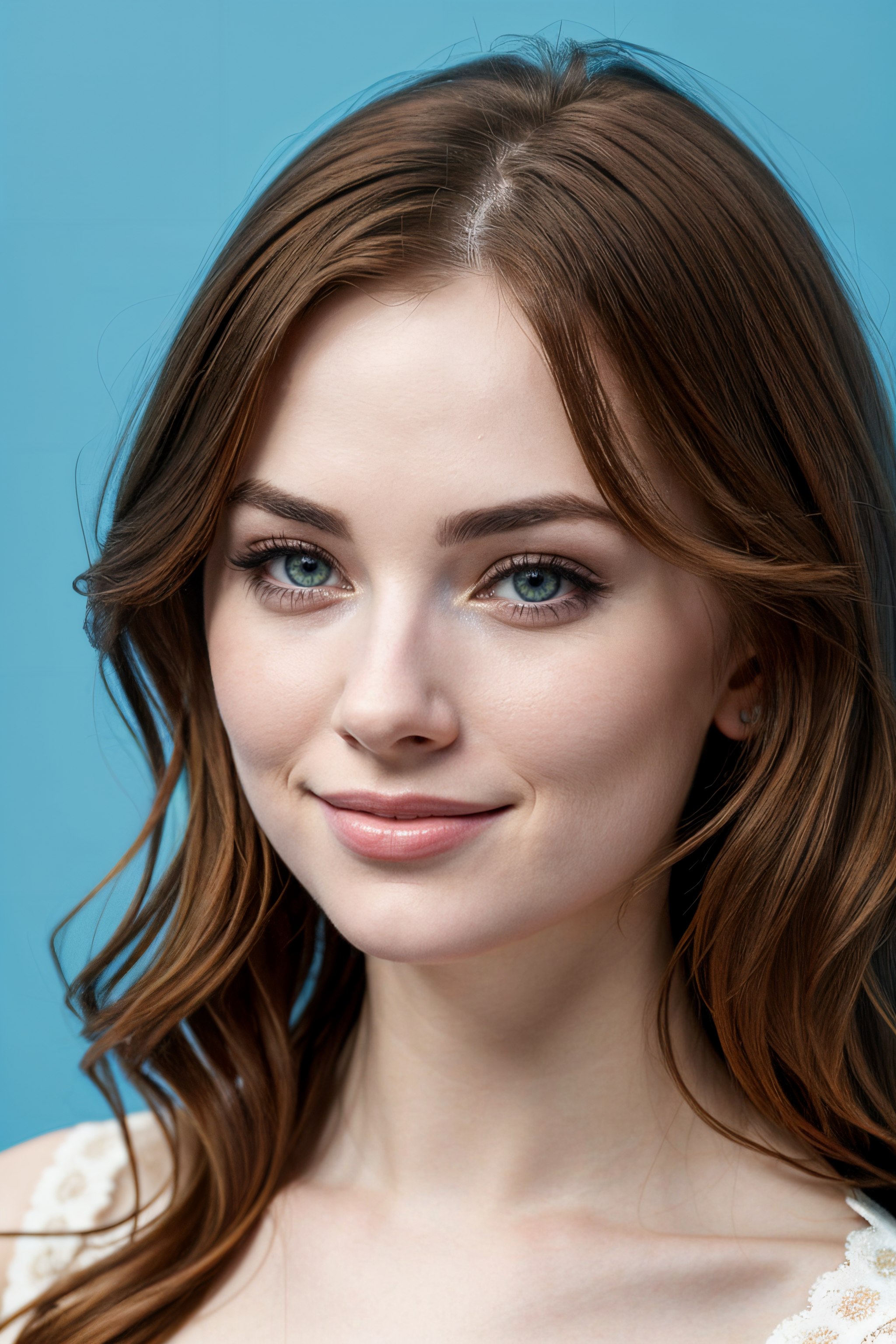 simple background, blue_background, ((wallpaper 8k)), ((high detailed)), ((masterpiece)), ((best quality:1.2)), ((hdr)), ((absurdres)), ((RAW photo)), 1girl, 20yo woman, young, pale skin, brown hair, wavy hair, portrait, upper body, beautiful woman, green_eyes, , beautiful smile, perfact face, open mouth, looking at viewer, perfect face shape, high detailed skin, <lora:add_detail:1>