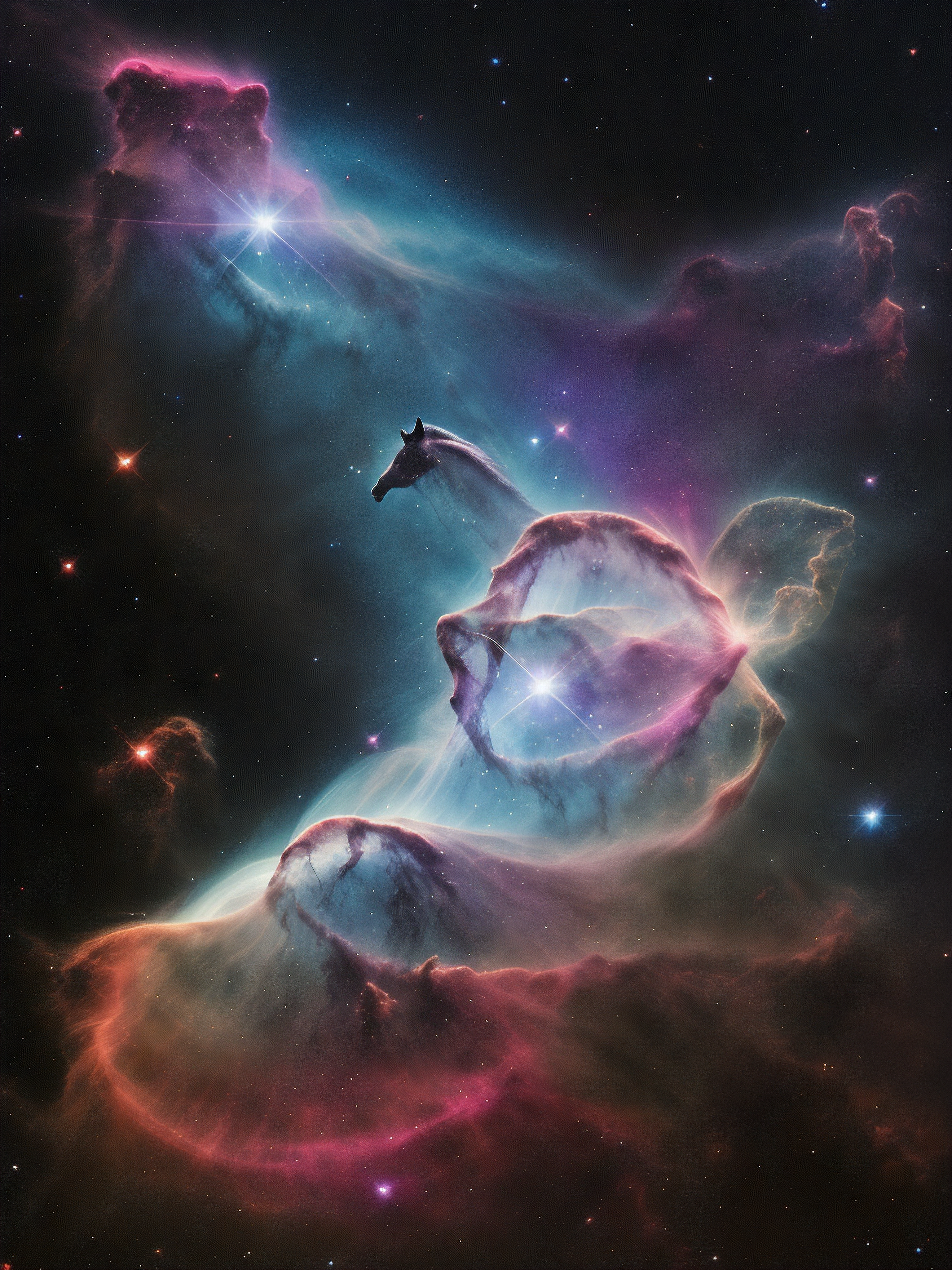 outer space transparent (horse shape) nebulae cosmic fog mist shape (nebula beautiful full cloaked (shadow transparent) horse shape:1.1), (8k, hubble telescope image)