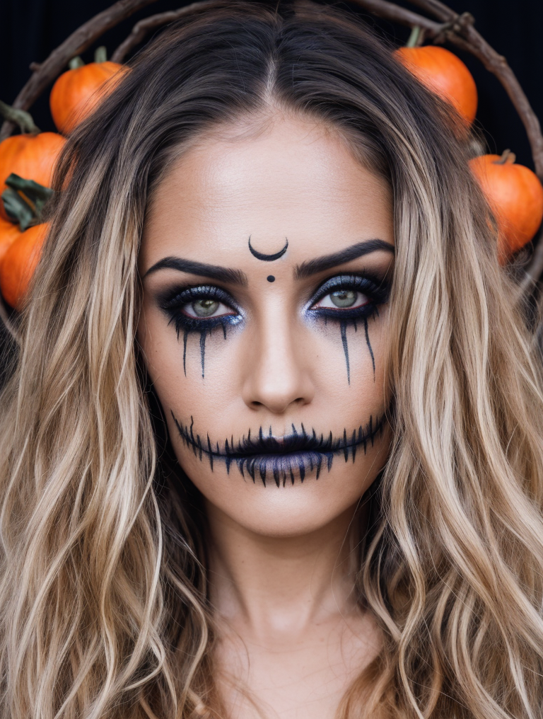 RAW photo, 1girl, [Salma Hayek|Marilyn Monro|(Jennifer Aniston:0.8)], perm hair, HWmakeup, (Halloween costume:1.1), complex Halloween cafe background, autumn, Halloween, Halloween theme, Halloween colors, (cozy atmosphere:1.2) <lora:HWmakeup:0.7>, 8k uhd, dslr, soft lighting, high quality, film grain, Fujifilm XT3, (intricate details:0.9), (hdr, hyperdetailed:1.2)