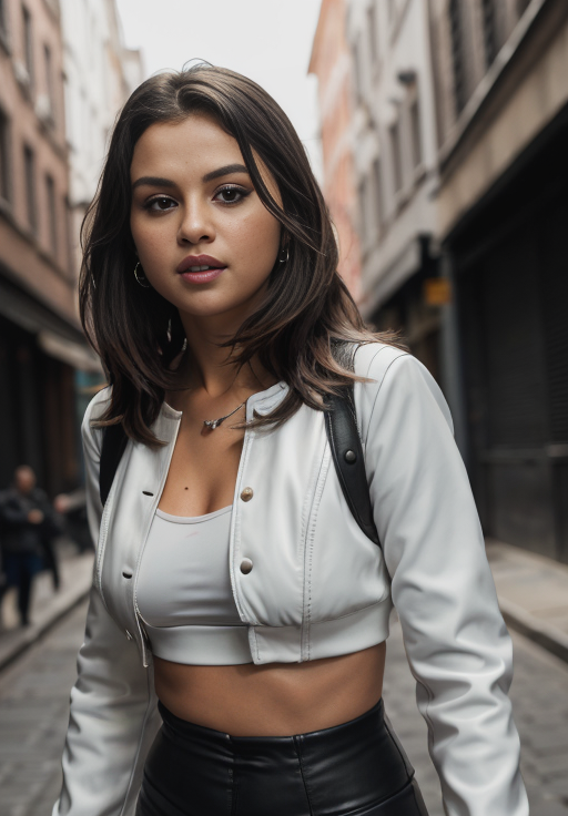 RAW photo, a beautiful SelenaGom3z <lora:SelenaGom3z2-v15-byShurik:1> in a bustling metropolis, weaving through crowded streets and dark alleyways, close up, leather jacket, white tshirt, black leggings, detailed eyes, flowing hair, determined expression, shiny glossy skin, subsurface scattering, (high detailed skin:1.2), 8k uhd, dslr, soft lighting, high quality, film grain, Fujifilm XT3