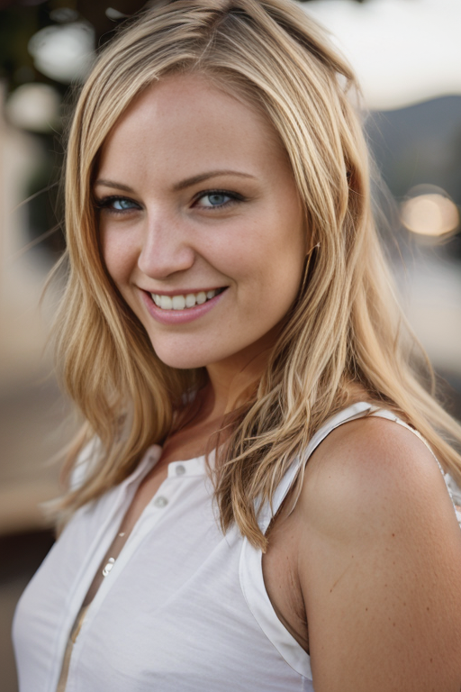 <lora:m4l1n4:0.9>, a Realistic photo of m4l1n4 woman with blue eyes and blonde Hair style, long hair, looking at viewer, blue eyes, blonde hair, teeth, grin, lips, portrait, realistic, soft lighting, professional Photography, Photorealistic, detailed eyes, RAW, analog, sharp focus, 8k, HD, DSLR, high quality, Fujifilm XT3, film grain, award winning, masterpiece
