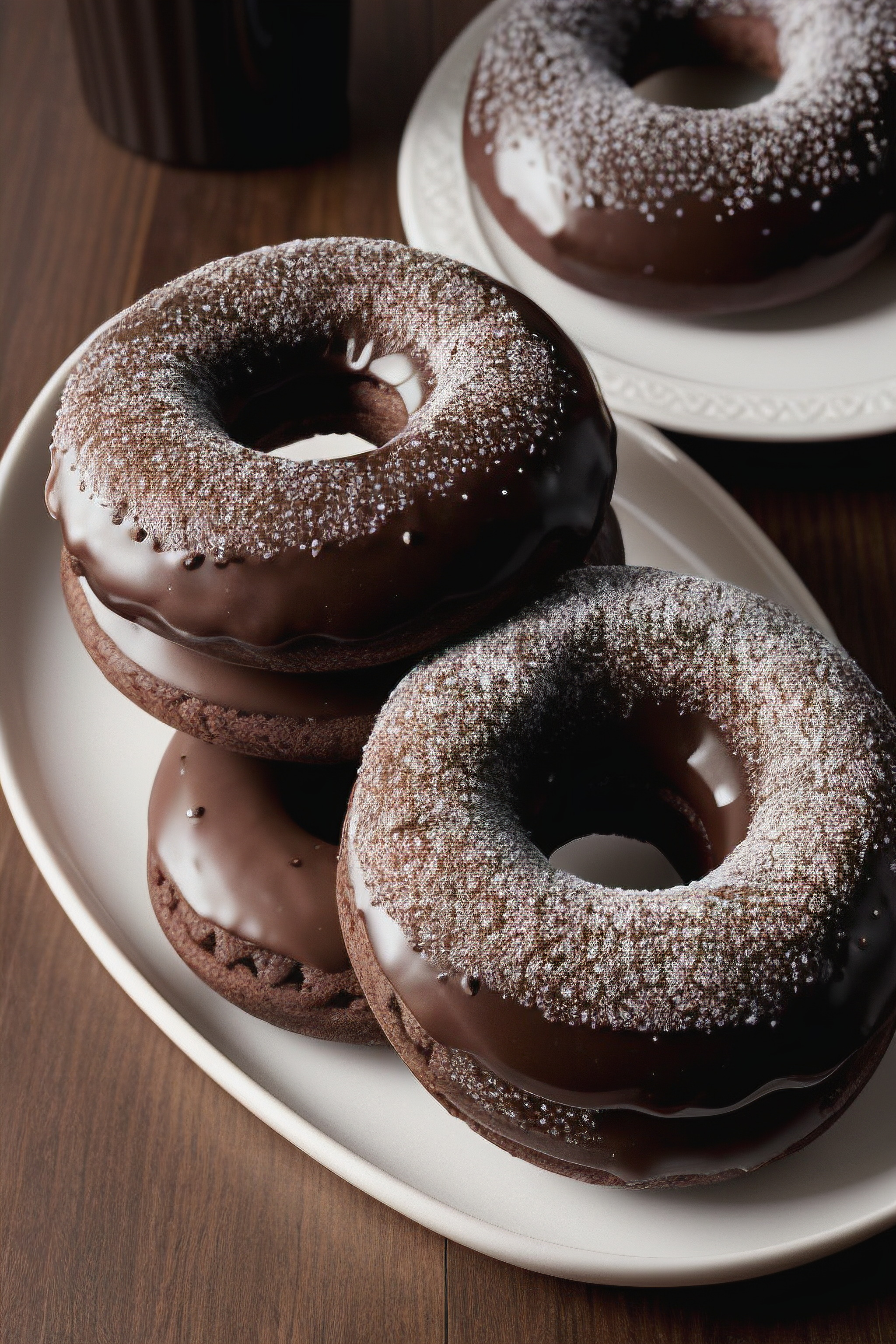 Photo of delicious looking chocolate donuts on table, photorealistic, hyper quality, intricate detail, masterpiece, 8k,
