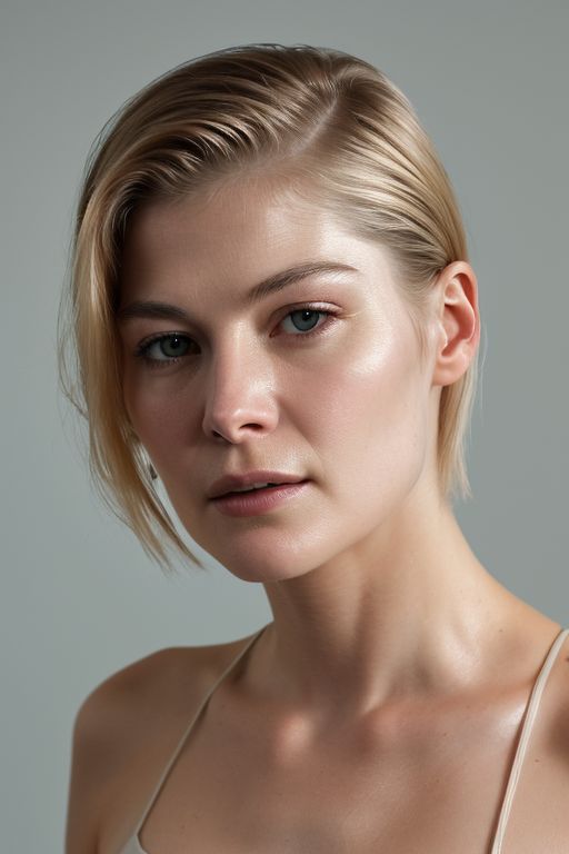face closeup photo of (CR-RosamundPik3-JernauGurgeh:0.95) as a (young:1.0) woman in grey background, (oiled shiny skin:1.1), (tilted angle shot:1.0), slick undercut hair, (8k uhd:1.0), (best quality:1.0), (masterpiece:1.0), (sharp focus:1.0),