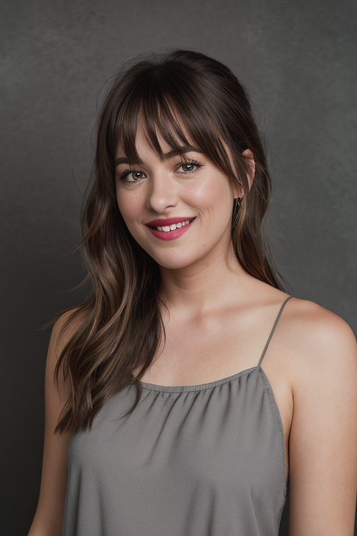 <lora:d4k0t4:0.9>, a Realistic photo of a d4k0t4 woman, looking at viewer, simple background, brown hair, bare shoulders, upper body, teeth, grey background, grin, arm up, lips, realistic, soft lighting, professional Photography, Photorealistic, detailed, inside a dark Studio Room background, blurred background, RAW, analog, sharp focus, 8k, HD, DSLR, high quality, Fujifilm XT3, film grain, award winning, masterpiece