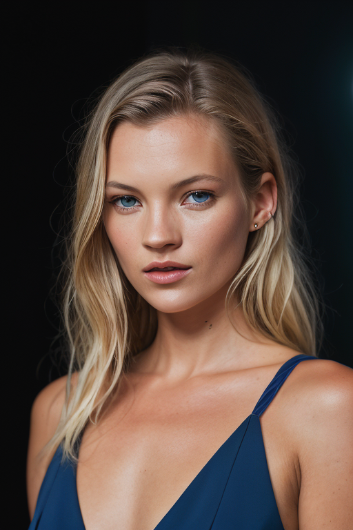 <lora:k4t3m0ss:0.9>, a Realistic photo of k4t3m0ss woman, long hair, looking at viewer, blue eyes, blonde hair, brown hair, shirt, jewelry, lying, bracelet, lips, blue background, ring, on stomach, head rest, realistic, soft lighting, professional Photography, Photorealistic, detailed eyes, RAW, analog, sharp focus, 8k, HD, DSLR, high quality, Fujifilm XT3, film grain, award winning, masterpiece