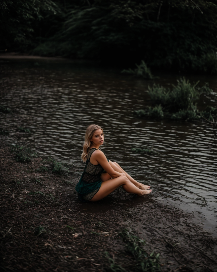 photo of a woman sitting, (sandy beach:1.2), shoreline, (Billie Eilish:0.9), (Kate Mara:1.1), f 1.2, forest, jungle, f1.2, by Raymond Han, magic hour photography, dusk, serious, (8k UHD:1.1), (film grain:1.1), (raw photo:1.1), full resolution, highly detailed skin, detailed hair, dslr, sharp focus, high definition, high quality photography, intricate