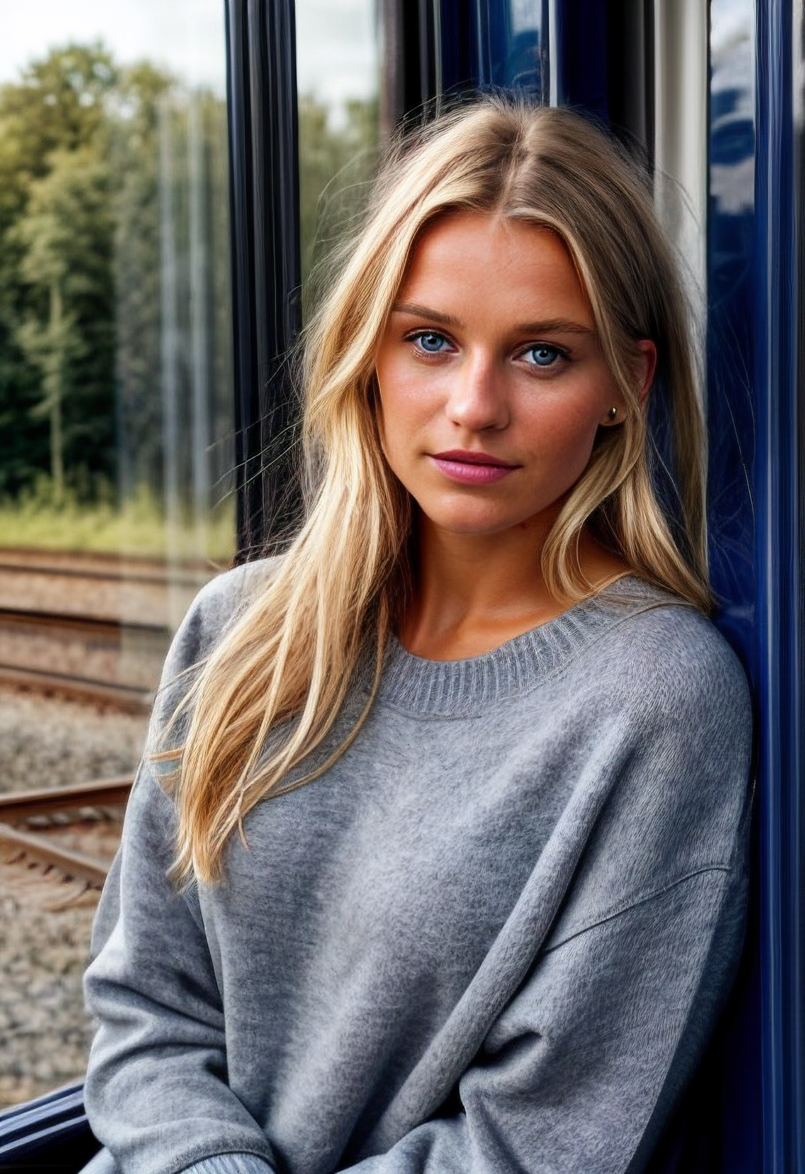 a photo of a young (cute:1.2) dark-blonde Scandinavian intelligent relaxed woman sitting in a train wearing a pullover, tanned skin, blue eyes, full lips, broad cheek, sunny weather, blurry Scandinavian town silhouette in the background outside the window, masterpiece, detailed skin, realistic skin, ultra realistic, realistic light, photorealistic, hair behind one ear, sun shining outside