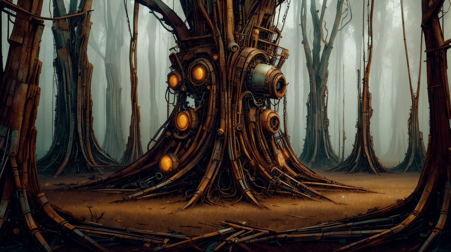 RAW Photo of worldofscrap trees intertwined with cybernetic wires in a futuristic forest, corroded, broken, junker <lora:WorldofScrap:1><lora:add_detail:0.6> <lora:LowRa:0.2>, (Masterpiece:1.3) (best quality:1.2) (high quality:1.1), highly detailed,perfect proportions,sharpen,16k resolution,HDR,sharp shadows,bloom,awe inspiring,enchanting atmosphere,cinematic color grading