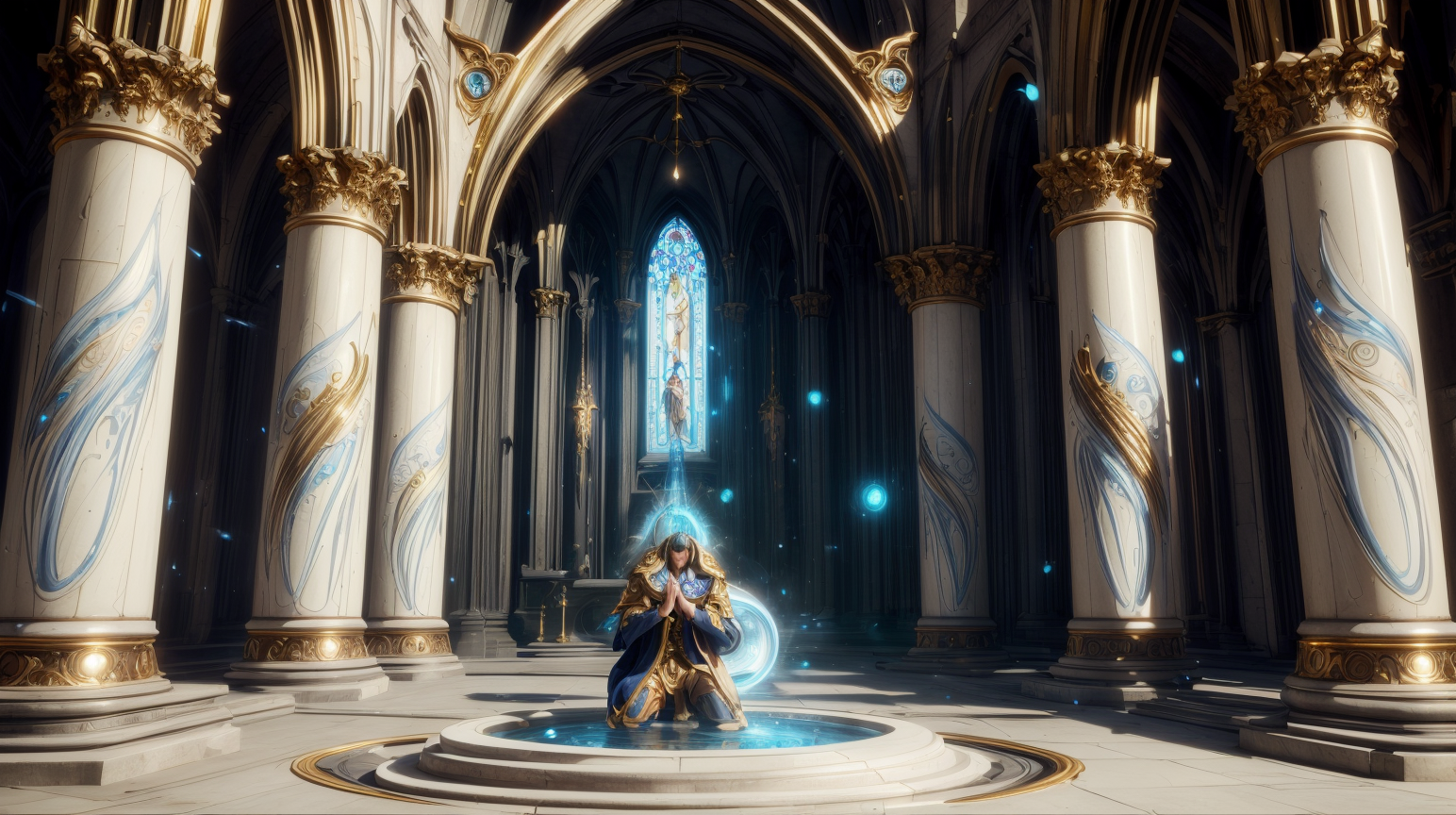 RAW Photo of orokintech (style-swirlmagic:0.8), focus on character, portrait, looking up, solo, upper body, detailed background, detailed face, (<lora:DecorationBundlev2:0.6> EbonyGoldAI theme:1.1) holy prophet, gentle expression, blue cross symbols, halo above head, kneeling, praying, symmetrical composition, cathedral, altar, divine aura, stained glass, floating particles, filigree, swirling lights emanating, urn, basin of holy water, majestic atmosphere, medieval high fantasy style, gold, updraft,, smooth, gold, scifi <lora:OrokinTech-20:1><lora:add_detail:0.6> <lora:LowRa:0.2>, (Masterpiece:1.3) (best quality:1.2) (high quality:1.1), complementary colors,film lighting,fine details,concept art,lens flare,dappled light,unreal engine,sharp shadows,fantastical,film still from