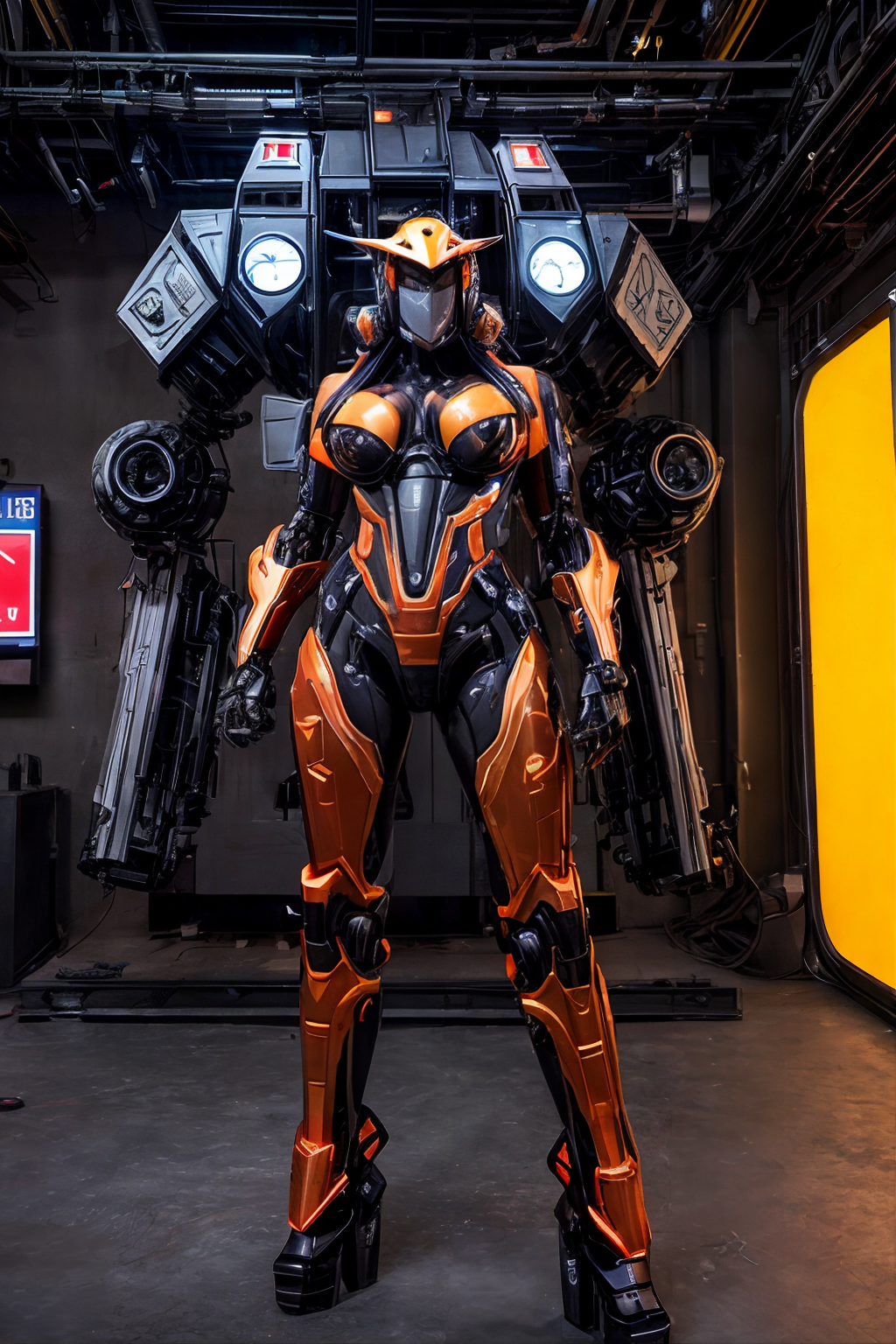 exhibitionism, (sexy:1.2) busty (xmech robot:1.4), (facing viewer:1.2), full body, looking away, (inside workshop:1.2), cncgdiai, public nudity, Playful, cinematic, sensual, 8k, studio lighting, sharp focus, RAW color , scifi future neon city, neo city