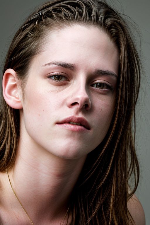 (CR-Kv1st1nStewart-slgmoon:0.99), full color portrait of woman, (oiled shiny skin:1.0), (face closeup:1), masterpiece, best quality, sharp focus, 8k highres, ultra-detailed, rim light, (grey background:1.0),