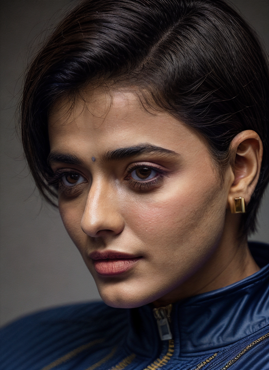 closeup portrait of skswoman, woman, indifferent , wearing jumpsuit , with Pixie cut , background court epic (photo, studio lighting, hard light, sony a7, 50 mm, matte skin, pores, colors, hyperdetailed, hyperrealistic), <lyco:Ketika SharmaV3:1.0>