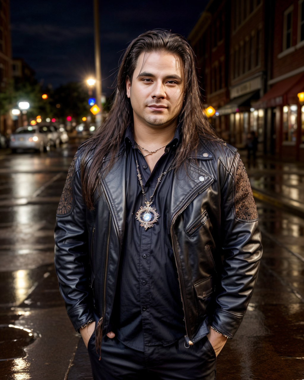 (best quality:1.13), (realistic:1.1), (detailed:1.15),(skin details), Dappled Light, (look at viewer), (skin texture), (realistic texture skin), cinematic light, side lighting, ultra high res, best shadow, (Dutch angle:1.1), lightroom, cinematic, (intricate:1.4), high quality, intricate details, low contrast, 1man, photo of AndreMatosQuiron person man, long hair, detailed background, jewelry, black jacket, pants, necklace, white collared shirt, formal, (rampage:1.2), <lora:quiron_AndreMatos_v2_lora:0.79>, Reflections in Puddles: After rain showers, capturing reflections of city lights or surrounding scenery in puddles can produce abstract and visually intriguing compositions.,