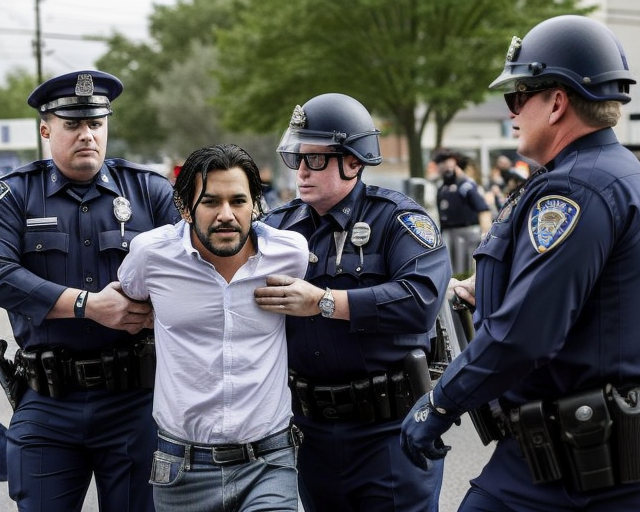 handcuffed Lobo, escorted by two cops at protest, crowd in background <lora:handcuffed:0.6>