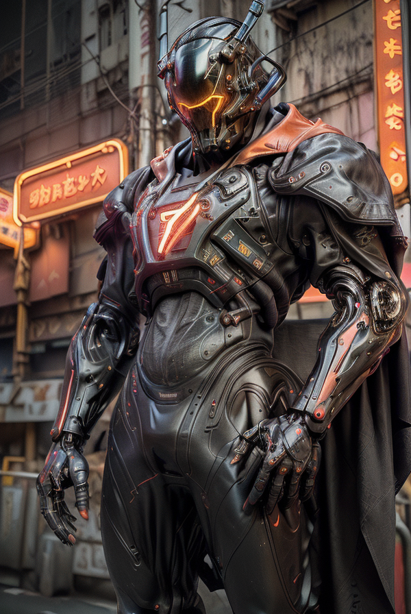 (night time:1.3), (Hongkong neon lighting:1.5), dark theme, dark clouds, thunder and lightning, realistic, complex 3d render ultra detailed, mecha, cyborg, best quality, masterpiece, ultra high res, cowboy shot, (photorealistic:1.4), raw photo, official art, absurdres, vague, Atmospheric, evil, tank, dynamic angle,upper body. ((Armed with both hands)), red glowing, cyberhelmet, tech lights on the body, Majestic pose, mechanical arms, science fiction, no humans, cyberpunk feeling, (Wearing a tattered cloak), (floting in sky :1.3), smoke of gunpowder, war, neon lights, RAW photo, 8k uhd, dslr, daylight, high quality, film grain, Fujifilm XT3 <lora:cyberhelmetv0.7:0.8> <lora:Niji:0.8>