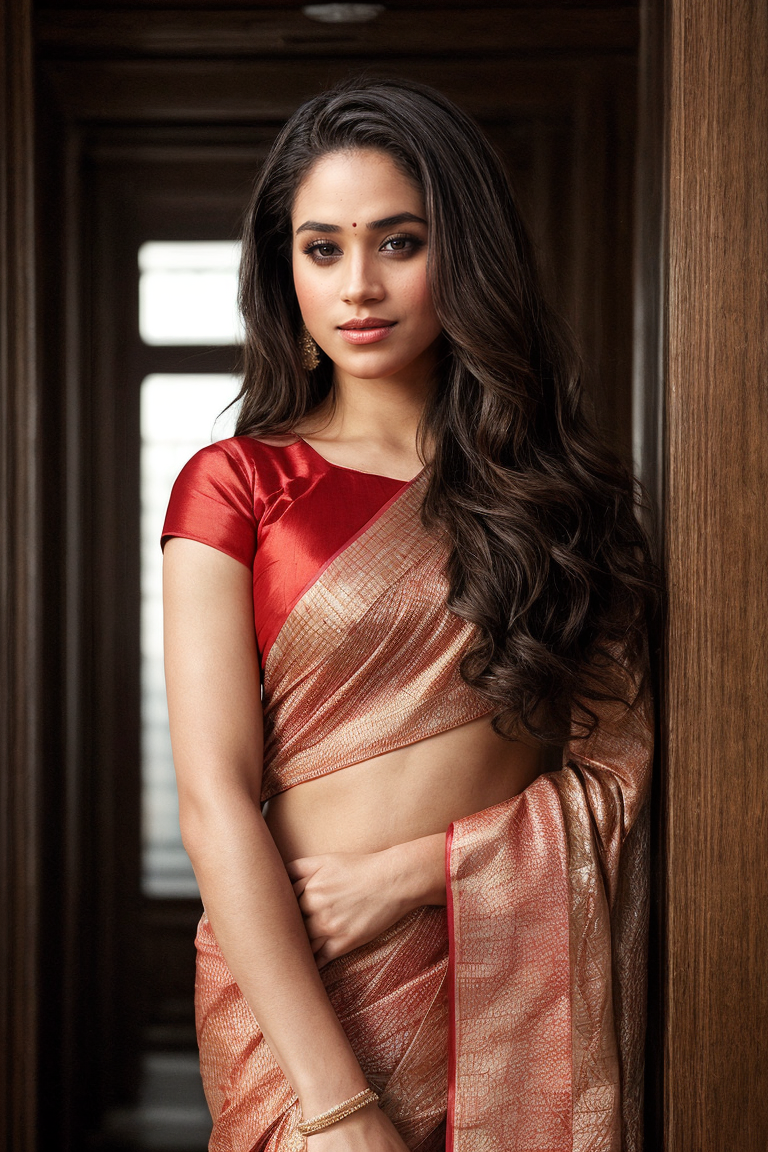 masterpiece, stunning closeup portrait photo of (mghn woman:1.0), (wearing saree:1.2) <lora:MeghanMarkleDogu:1>
