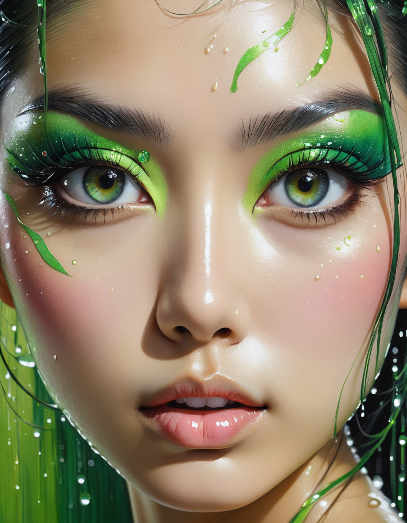 <lora:add-detail-xl:1>, oil painting and pen, beautiful female Japanese woman wearing a bright silver and green makeup, wet skin, close-up view, intricate detail, absurdres, thoughtful expression, large eyes, dramatic lighting, highly detailed, perfect symmetry