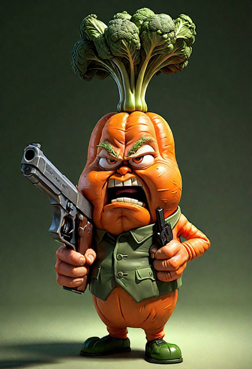 a grumpy carrot Holding a pistol in his/her detailed hands <lora:Pistolero-000015:0.8>