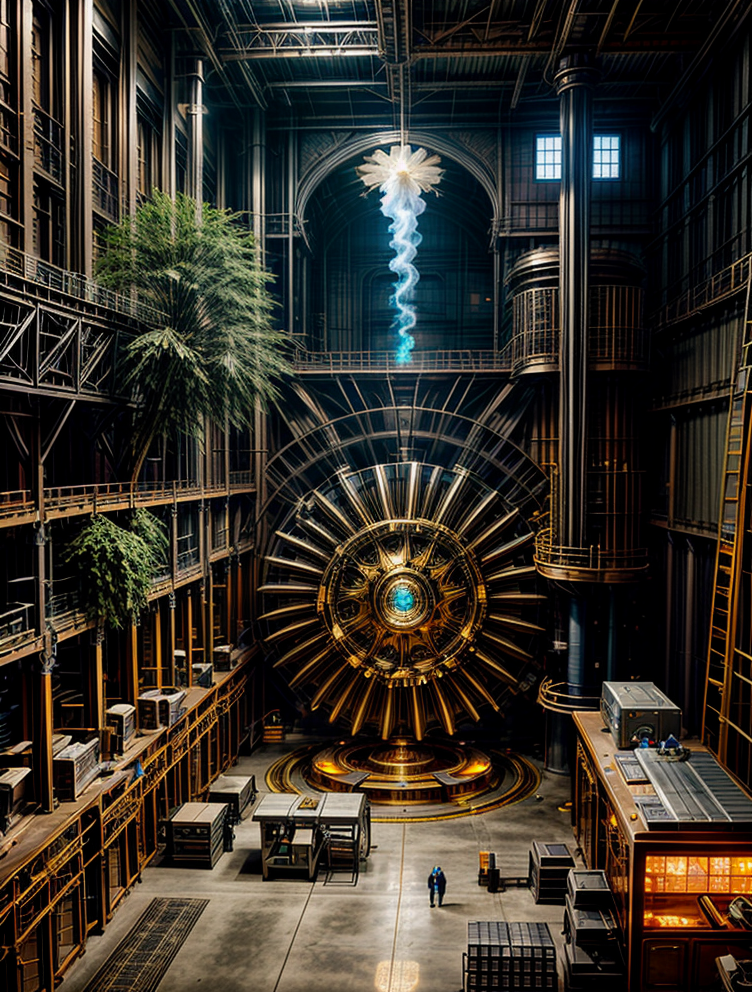 bird's eye view, ((((large laboratory)))) in a dusty warehouse, photorealistic photo of a steampunk machine that opens a portal to an alien world, (((((No people))))), Octane Render, large fusion mechanical device with complex gears and ((glowing gems)), blooming, ((steam)), gold, large pistons, steam, pipes, steampunk, ultra detail, 8k, portal, spark, timewarp, gravitational lens, the universe, <lora:more_details:1.6>, <lora:wowifierV3:.8>