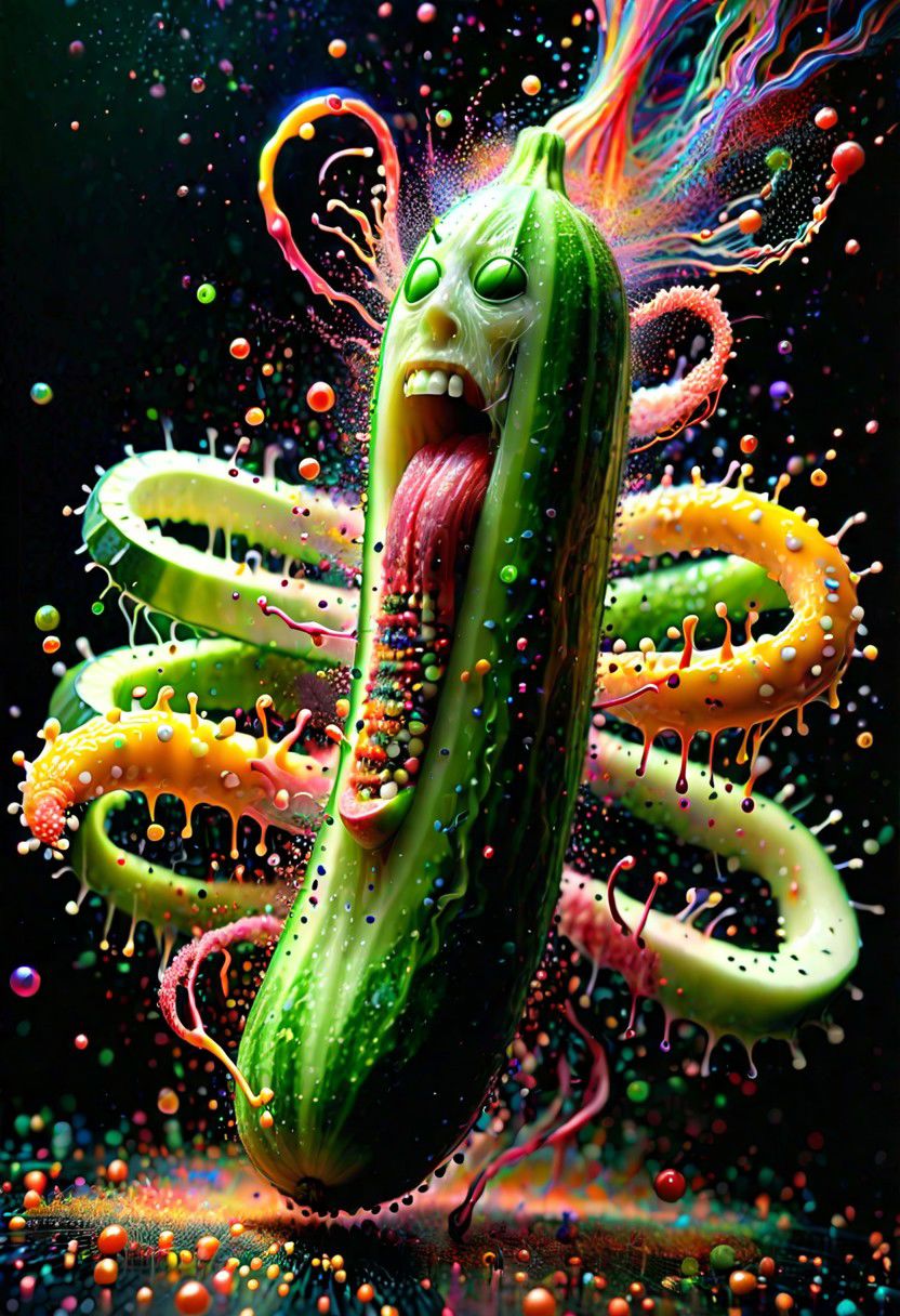 a cucumber but with veiny human flesh, with putrid stench wafting in the air and ais-particlez emanating in a dazzling array of colors, enveloping the entire scene. <lora:Particles_Style_SDXL:1>